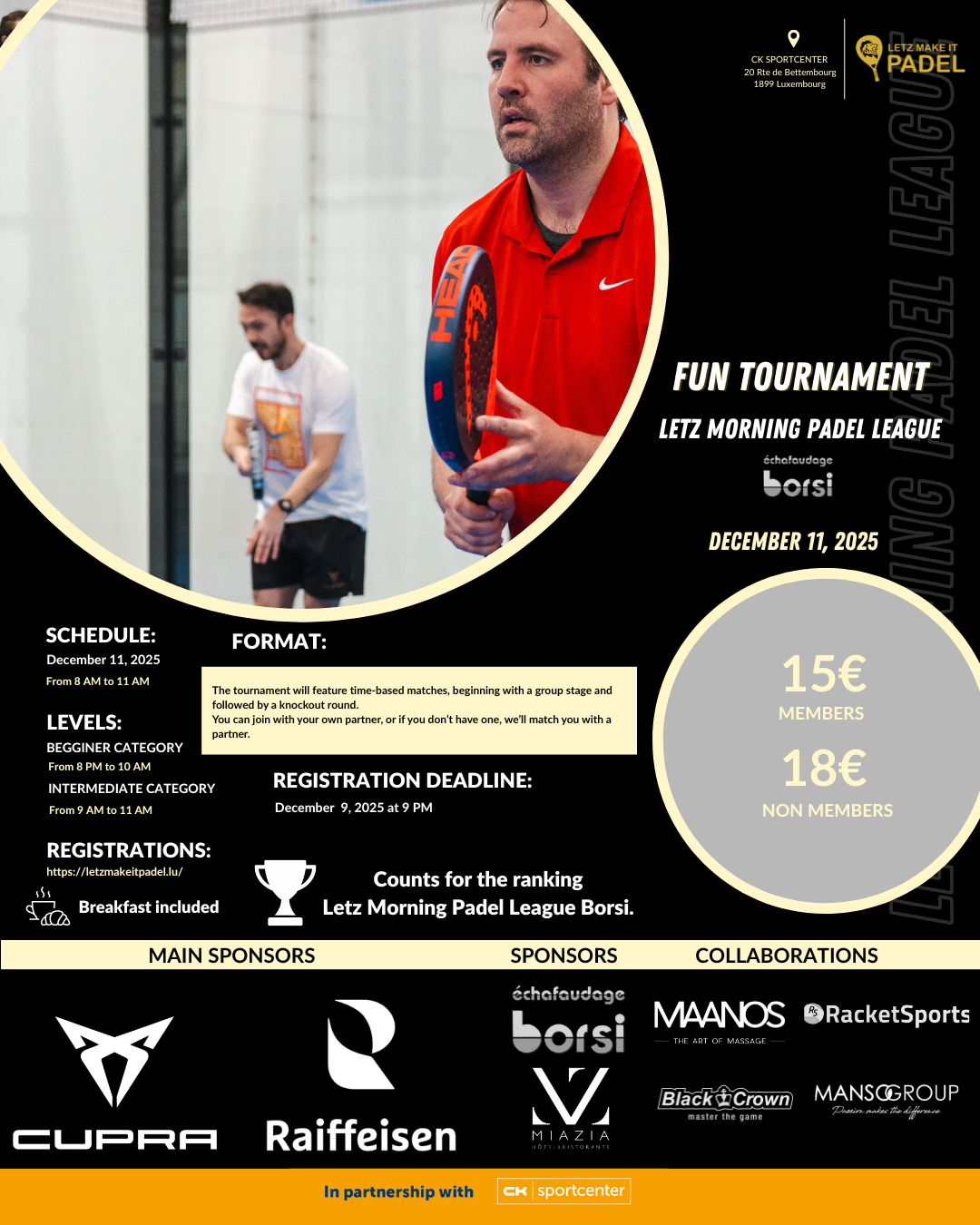 The Fun Tournament (Letz Morning Padel League Borsi) is a tournament that will feature time-based matches, beginning with a group stage and followe...