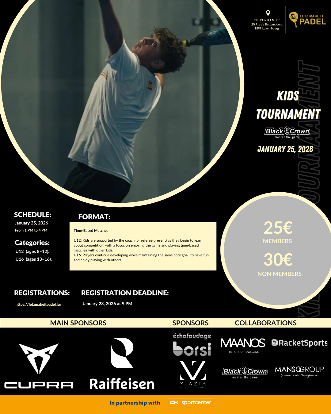 A fun and friendly tournament designed for young players to enjoy padel and learn about competition. The tournament features two categories: U12, w...