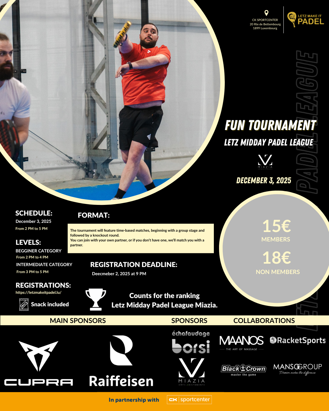 The Fun Tournament (Letz Midday Padel League Miazia) is a tournament that will feature time-based matches, beginning with a group stage and followe...