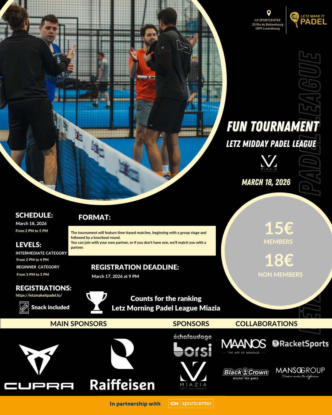 The Fun Tournament (Letz Midday Padel League Miazia) is a tournament that will feature time-based matches, beginning with a group stage and followed by a knockout round.